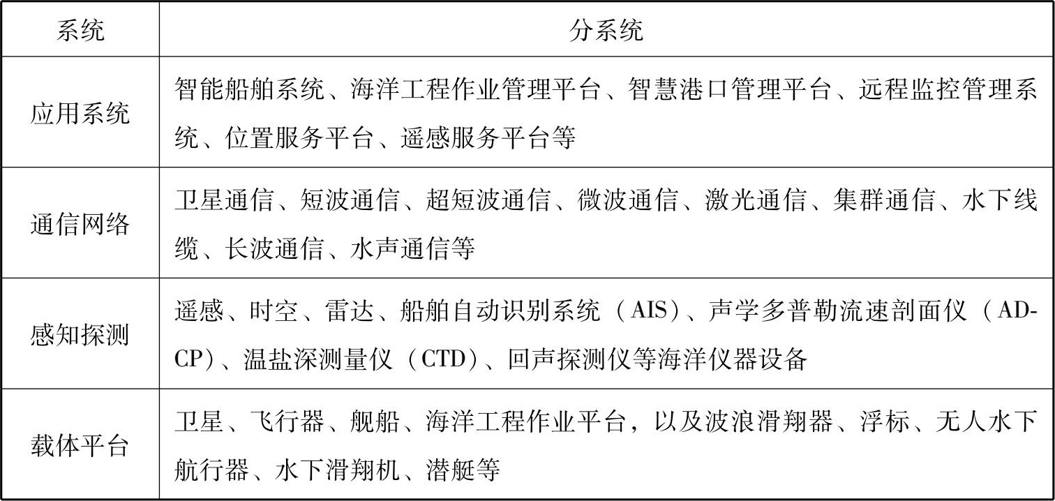 电子信息单位在理论上经过适海性改造后均可涉海,但受制于海洋认知、海洋活动人员、涉海技术积累、相关市场空间等因素制约,涉海的单位仅为海洋电子信息业的一部分。海洋电子信息业细分领域多且分散,规模效应不明显,尚处于培育期。根据此特点,海洋电子信息产值统计包括三个层面:有能力涉海的电子信息单位产值,涉海电子信息单位产值,涉海电子信息单位涉海业务产值。海洋电子信息产业可划分为应用系统(云:应用系统运营以及基于数据汇聚的应用与服务)、通信网络(管:海洋电子信息传输通道)、感知探测(端:终端设备与传感器),以及在空、天、地、海、潜5个空间维度(载体平台)组合应用,详见表1-1。