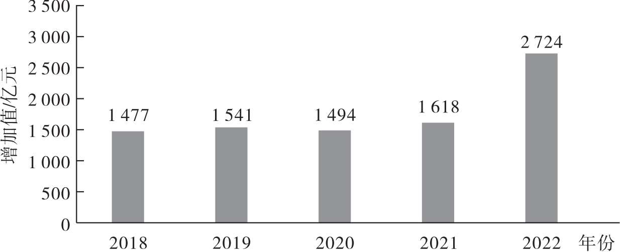 下游则是海洋工程装备的应用市场,包括海洋能源开发工程建筑、海洋工程项目总包、海上油田开采、海洋油气资源勘探开采、海洋服务等。近年来,我国主要海洋产业发展强劲,彰显了发展潜力与韧性。图1-11数据显示,2022年我国海洋油气业增加值2 724亿元,突破两千亿元,达到历史高位,同比增长68.3%。