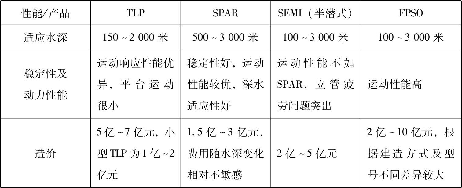 海洋油气开发设备种类众多。钻井平台和生产平台是海洋工程装备业最重要的两个产品。据统计,2022年钻井平台的新租约数量为379份,总时长为5 239个月。生产平台指的是后期用来抽取、提炼和存储海洋石油的平台,一般包括固定式和浮式两类。目前,浮式生产平台在市场上较为主流,浮式生产平台包含众多种类,如表1-4所示。