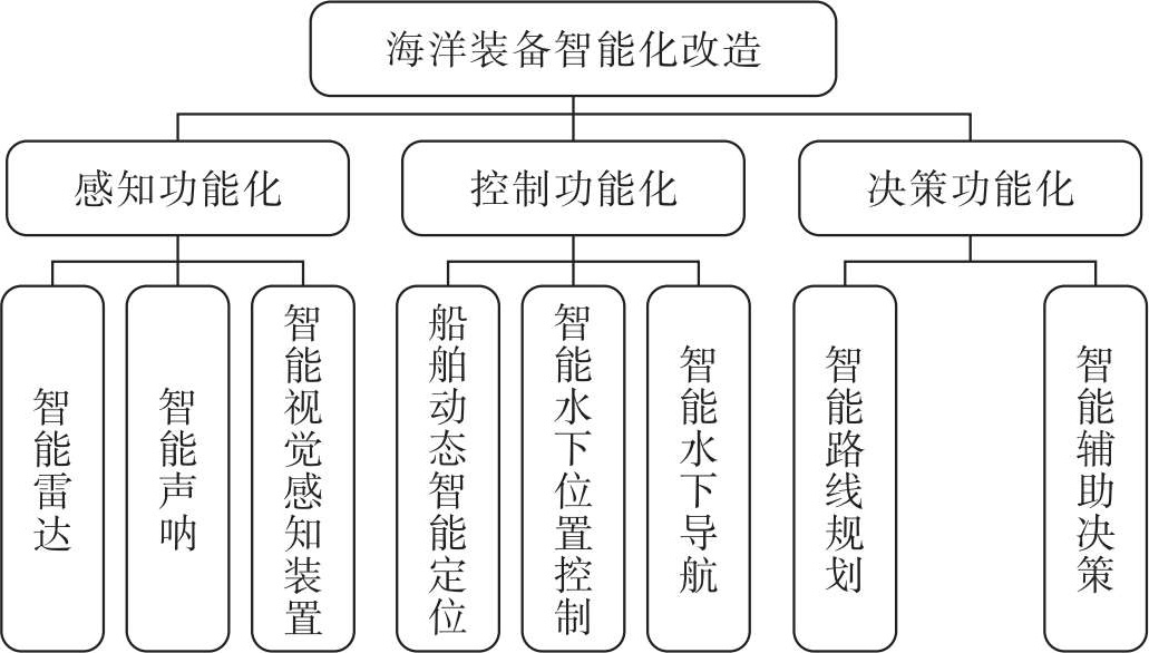 设备智能化可以渗透到海洋设备“建设、管理、运行、维护”等环节,如今,海洋装备的传感装置、控制系统、决策策略、运维技术、制造环境的智能化改造取得了重大进展。海洋装备智能化改造如图1-14所示。