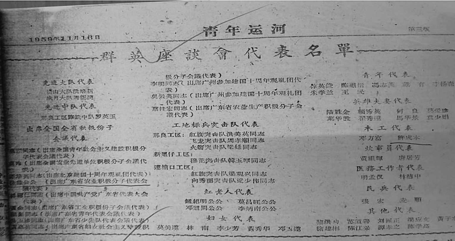 73岁的徐益公公是运河功臣模范,我作为20岁出头的小伙子,陪他参加地区三级干部会议。当时湛江开物资交流会,没有会场了,地区三级干部会议就在市一中的茅棚大礼堂召开。徐益公公上台介绍他参加运河建设的经过及体会,我做他的翻译,他说一句雷州话,我就说一句白话翻译他讲话的意思。我为他的先进事迹所感动。钟绍明三代人参加建库开河,他带着儿子、孙子在工地劳动。自己拉车,儿子拉车,孙子推车,这类事迹很感人。在如此艰苦的条件下,祖孙三代人坚持参加运河建设,参加劳动的时间又长,很了不起。