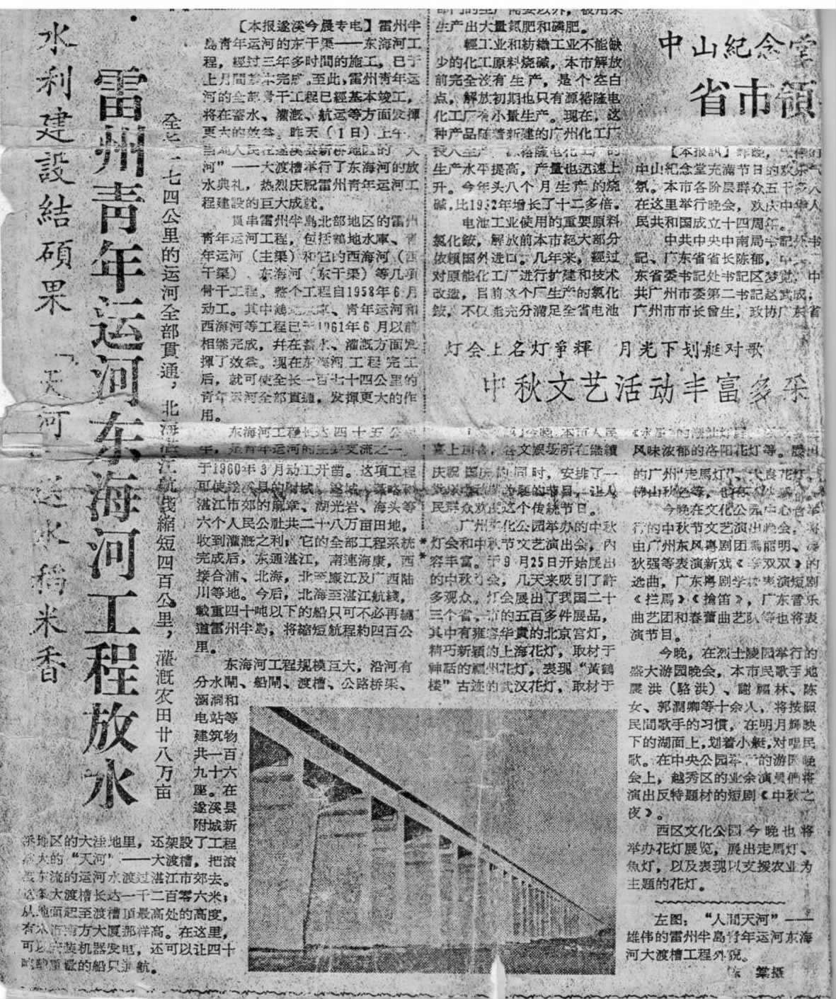 1963年10月2日,《羊城晚报》刊登青年运河东海河放水的新闻稿,是作家李士非和我合作写的。当天早上,我从大渡槽骑单车到遂溪县邮电局,将这份稿件以电报的方式发给《羊城晚报》。当天晚报还刊登了我拍摄的“人间天河”照片。