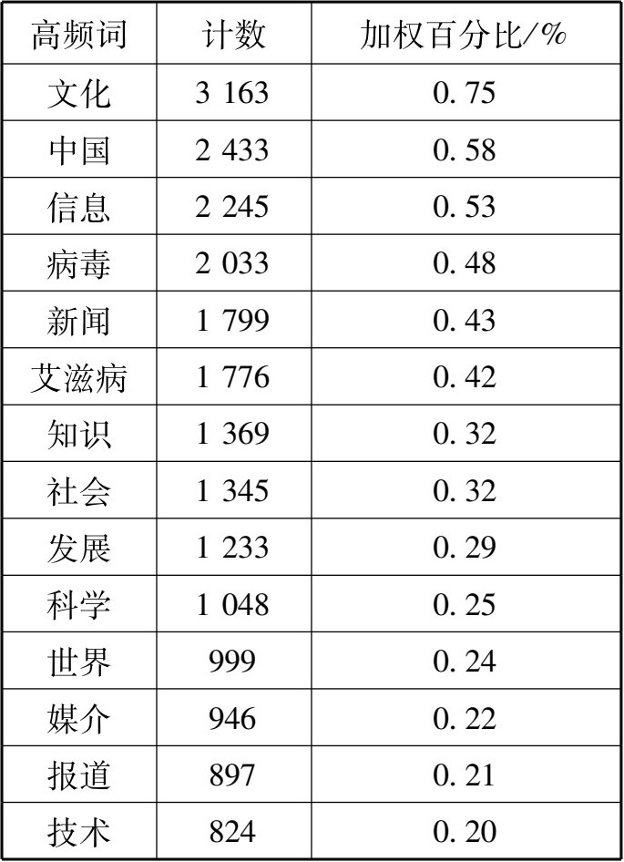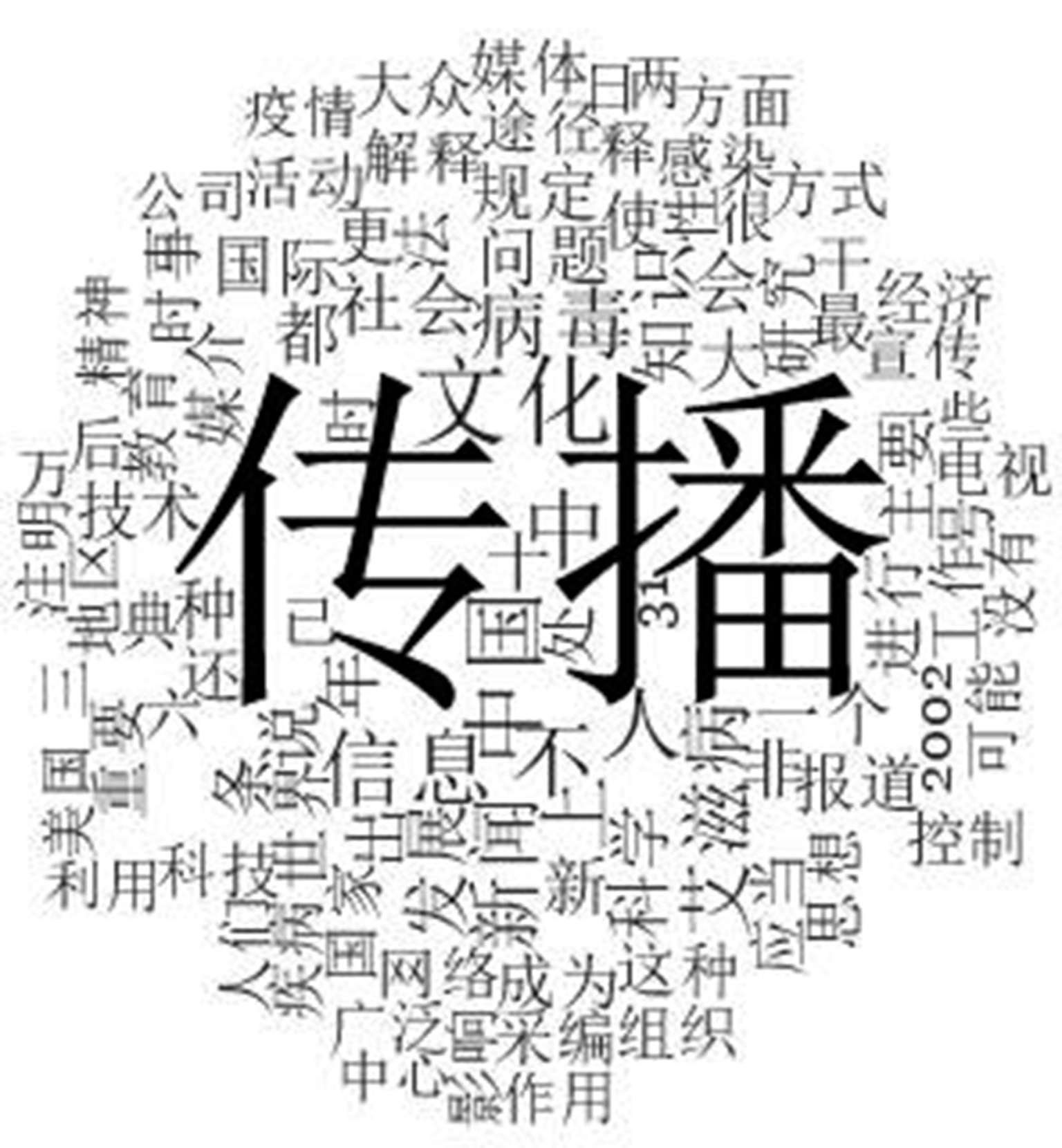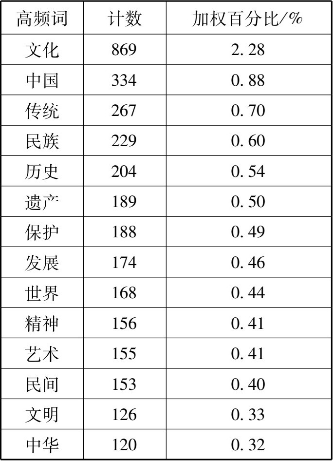 通过进一步统计分析(见表2-2、表2-3),我们可以看到“传承”与“传播”的高频词都有“文化”“中国”“发展”和“世界”,所不同的是“传承”的使用场景多是“传统”的、“民族”的、“历史”的,需要去“保护”,传承的内容多是“精神”“艺术”“文明”;“传播”的使用场景是“社会”的、“媒介”的,传播的内容多是“信息”“病毒”“新闻”“知识”“报道”“技术”等。