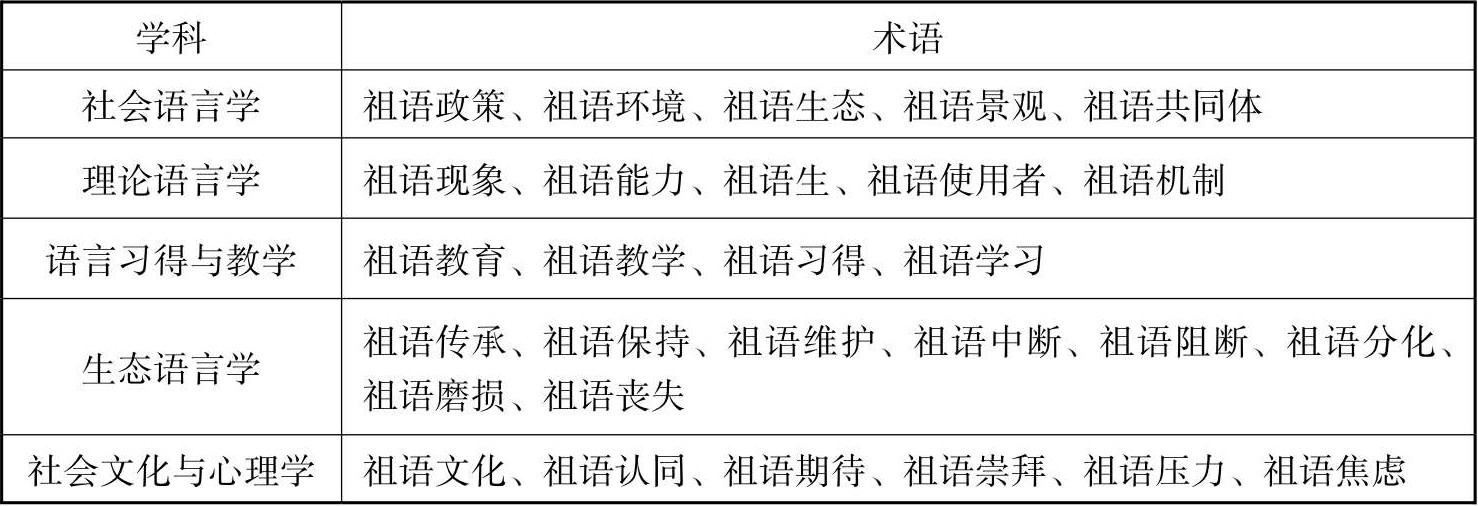本书从海外华语的角度,使用更能体现传承的“祖语”一词,并在郭熙(2017)祖语概念链术语群的基础上从社会语言学、理论语言学、语言习得与教学、生态语言学、社会文化与心理学等学科属性上对祖语概念相关术语进行了分类(见表2-1):