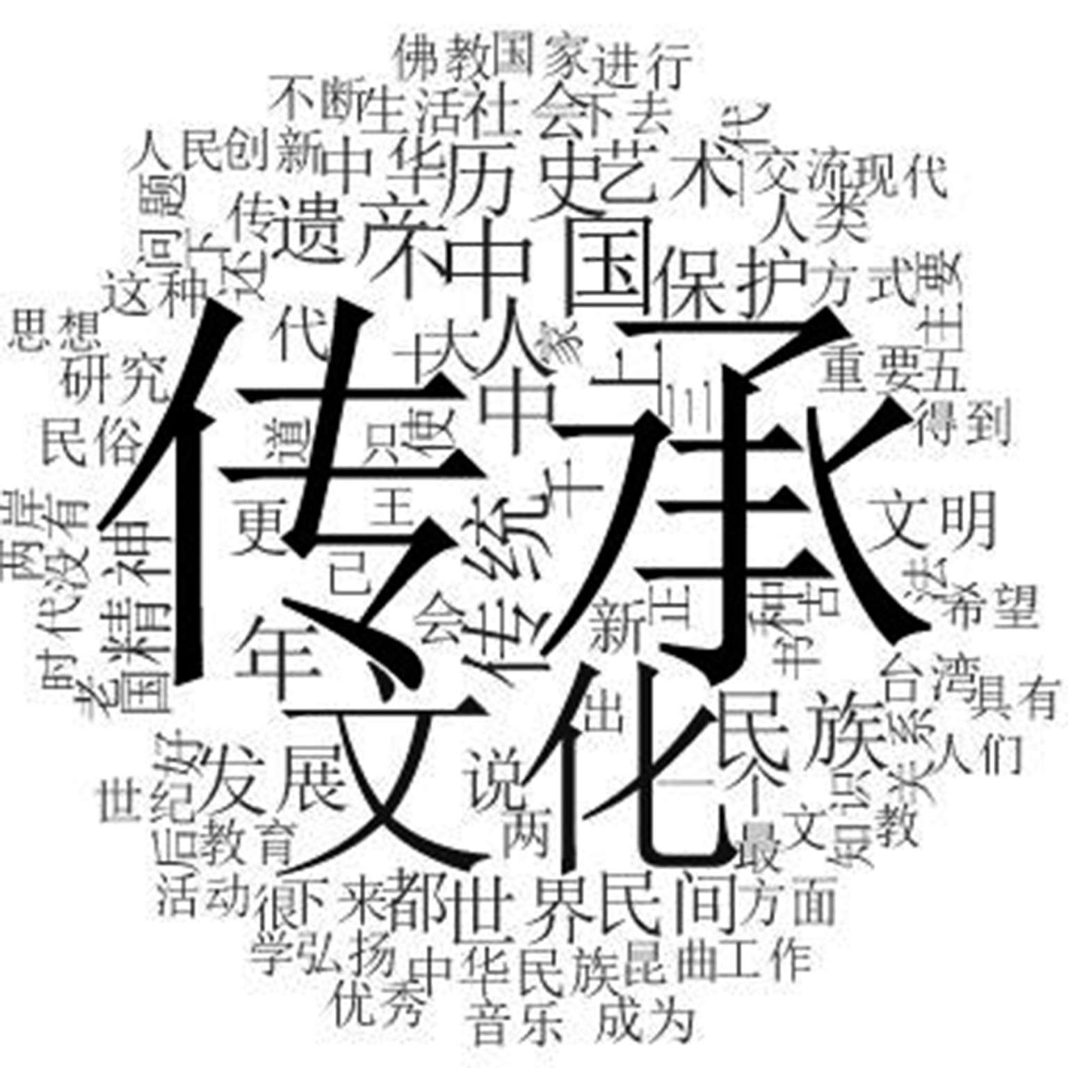 进行普通查询后,得到使用“传承”的语料1 562条、使用“传播”的语料16 541条。由此可见,在实际运用中“传播”的使用频次更高。我们把这些语料导入Nvivo12软件生成词库云(见图2-1、图2-2)。