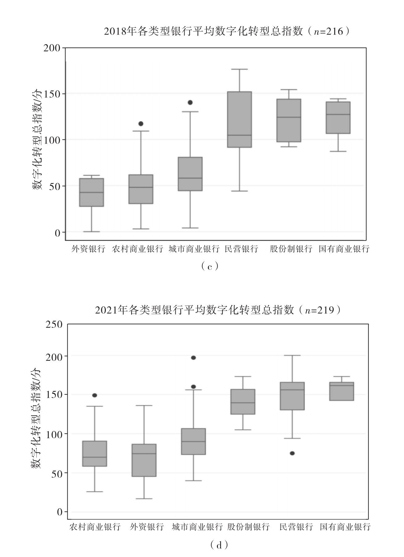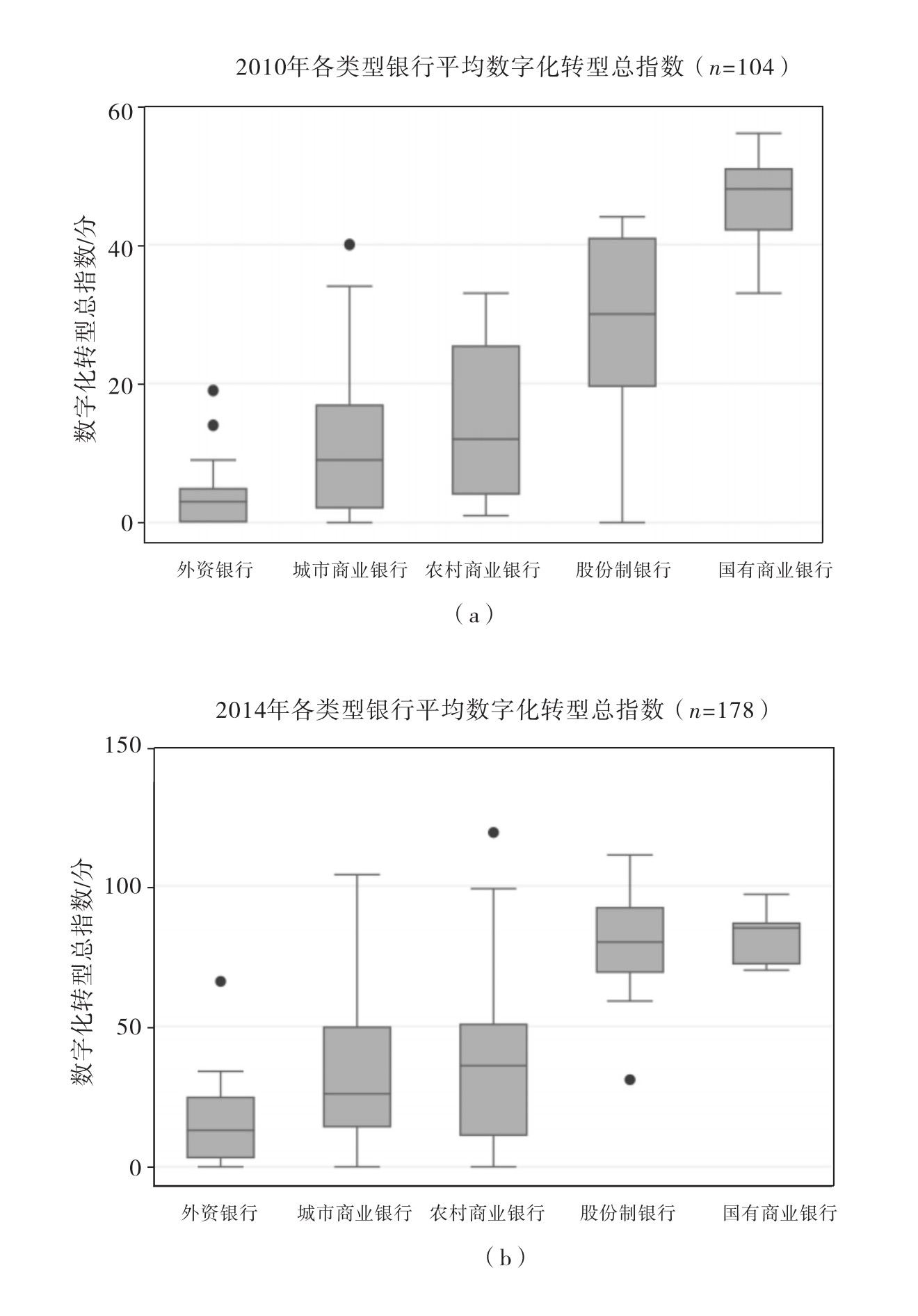 进一步地,通过箱线图对不同类型银行在数字化转型行为上的差异进行分析,并对2010年、2014年、2018年和2021年四个不同时期的表现进行对比(见图3-6)。在2010年,国有商业银行的数字化水平明显高于其他类型银行,股份制银行的数字化转型程度整体稍逊于国有商业银行,城市商业银行与农村商业银行的数字化水平相近,但从2014年开始,股份制银行和国有商业银行在数字化水平方面的差距已经不明显。2015年开始出现的民营银行数字化水平总体上仅次于国有商业银行和股份制银行,但各民营银行之间的差异较大。在2018年和2021年,城市商业银行与农村商业银行的数字化水平总体上依旧远低于国有商业银行和股份制银行,而且不同年份的城市商业银行和农村商业银行之间的数字化水平差异也较大。