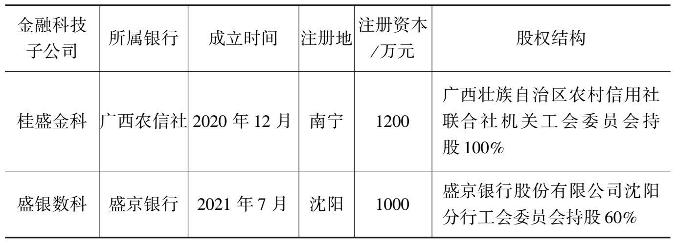 由于商业银行传统的组织架构制约了数字化转型进程的推进,同时考虑短时间大幅度调整管理框架可能导致商业银行经营混乱,部分商业银行在现有的组织架构之外成立新的聚焦于金融科技业务的子公司。商业银行数字化转型在组织维度上的一个重要表现是在旧有的组织之外成立金融科技子公司。成立金融科技子公司可以促使银行与金融科技实现更加深度的融合。一方面,银行在稳健运营、专业化、牌照、风控等方面发挥专长;另一方面,金融科技子公司可以在运营效率、业务创新、数据分析等方面为银行赋能,同时还可以进行技术输出,依托科技能力帮助商业银行拓展市场。基于优势互补的原则,银行系金融科技子公司应运而生,进而实现金融生态圈的整合与重构。就发展历程而言,银行系金融科技子公司的业务路径大多遵循由内到外的轨迹,即成立初期以服务本行集团及其子公司为主,随后逐渐扩展到服务同业,实现技术对外输出。截至2021年底,国内已有19家商业银行成立金融科技子公司,其中国有商业银行5家,股份制银行7家,城市商业银行4家,农村商业银行3家,基本情况如表3-1所示。