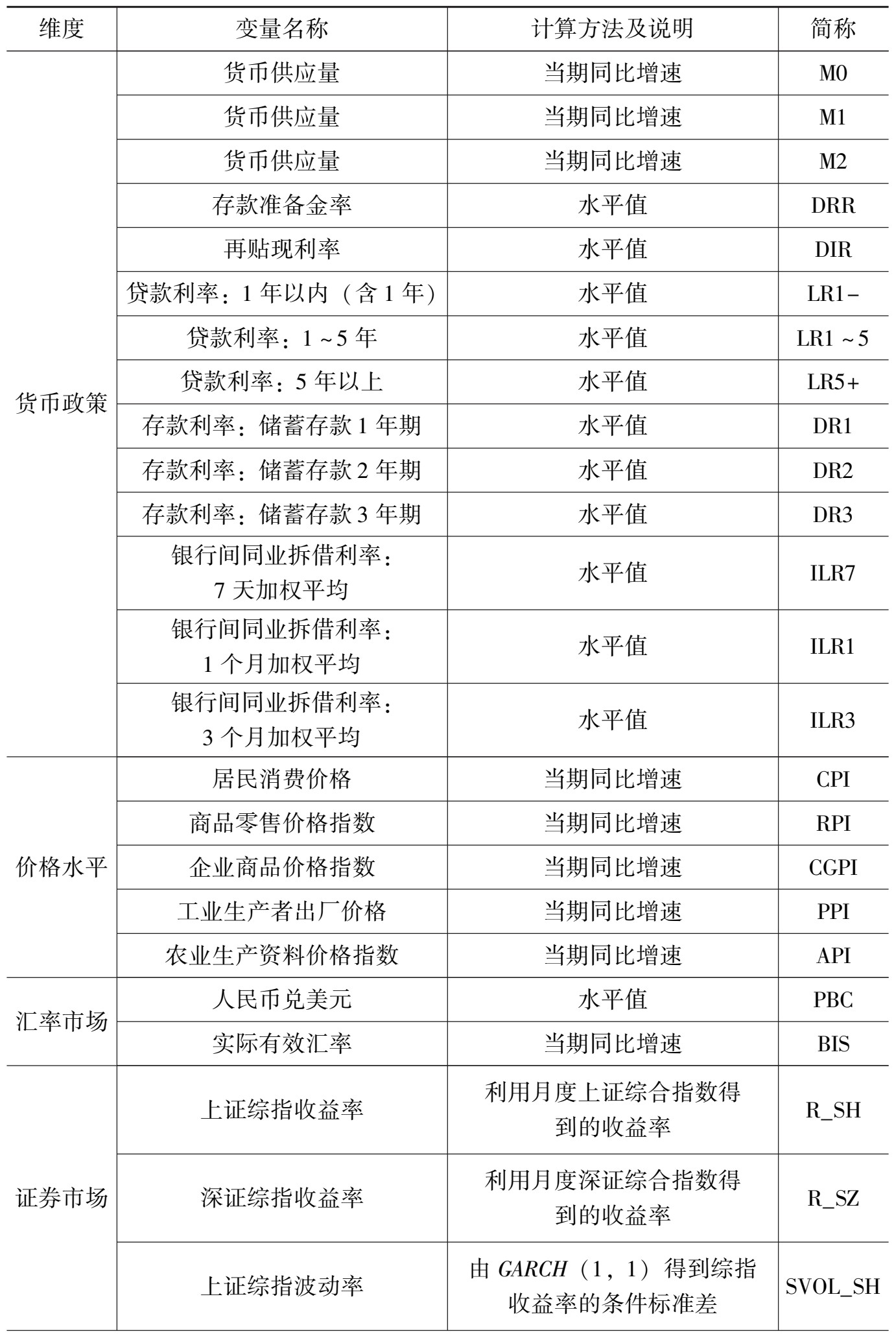通过主成分分析法对所有的条件波动率提取公共因子得到宏观经济不确定性指数,选取的货币政策有关变量14个,其他宏观方面的变量31个,一共45个变量,所选取的中国宏观经济变量详见表3-2。