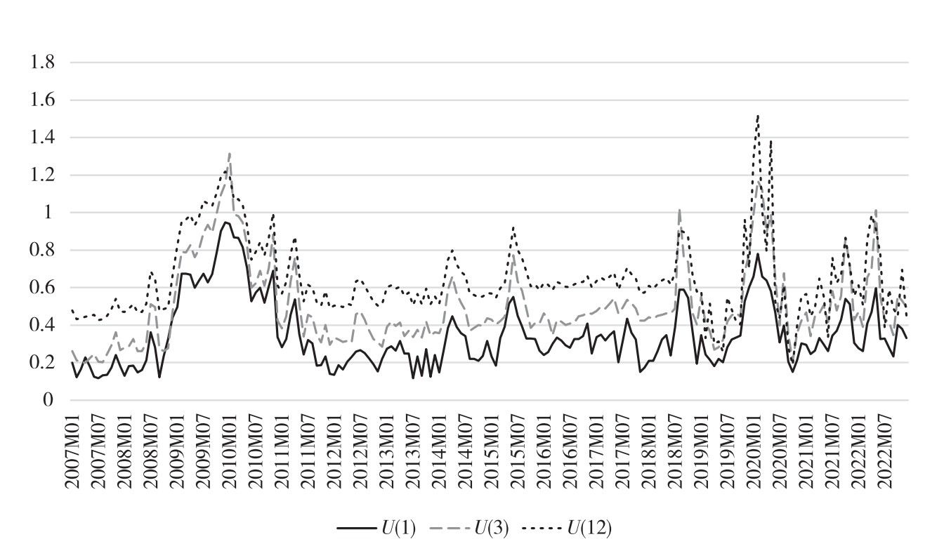[1] U (1)代表利用 t 期的信息预测未来1期的偏差, U (3)和 U (12)以此类推,样本区间为2007年1月至2022年12月。