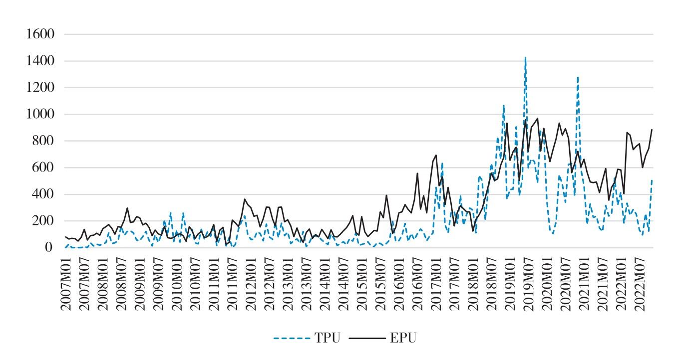 [2] 该指数以中国大陆的中文报纸《人民日报》和《光明日报》,与香港最大的英文报纸《南华早报》( South China Morning Post , SCMP )为分析对象,识别出报纸每月刊发的有关中国经济政策不确定性的文章,并将识别出的文章数量除以当月刊发的文章总数量,最终得到月度中国经济政策不确定指数。其中,TPU指数是根据《人民日报》和《光明日报》的新闻报道计算而得,EPU指数是根据《南华早报》的新闻报道计算而得。