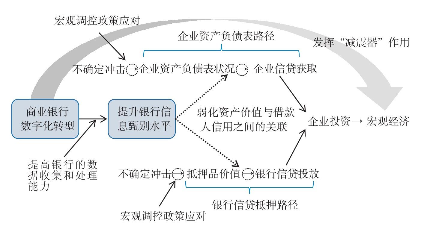 本书论证商业银行数字化转型可以发挥“减震器”效应的基本逻辑,如图1-1所示。信贷市场金融摩擦的存在是不确定冲击的影响被放大、宏观调控政策的传导效果被阻塞的重要原因。商业银行数字化转型的作用在于通过增加数字技术应用的广度和深度,提高银行收集数据和处理信息的能力,因此可以提升银行的信息甄别水平,减少信贷市场金融摩擦,降低信用关系构建过程中对抵押物资产的依赖,从而减弱抵押物资产价值因不确定冲击的影响变化对银行信贷投放和企业投资的影响。传统信贷模式使用抵押物或资产负债表缓解信息不对称问题衍生的金融摩擦,但以抵押担保为核心的信贷模式的一个弊端在于不确定冲击会对抵押物价值或企业资产负债表状况产生影响,由于银行投放信贷需要依赖抵押品或企业资产负债表以缓解逆向选择和道德风险问题,因此企业资产价值的变化会影响银行的信贷投放和企业的信贷获取,不确定冲击因为信贷市场金融摩擦的存在将沿着银行信贷抵押路径和企业资产负债表路径传递并加剧,导致企业投资减少,产出下降,最终作用于宏观经济,加剧经济波动。商业银行数字化转型通过提升银行信息甄别水平,减缓信贷市场中的金融摩擦,降低信用关系构建过程中对抵押品和资产负债表状况的依赖,因此可以弱化资产价值与借款人信用之间的关联,不确定冲击对抵押物资产价值的影响改变借款人信用资质的可能性下降,因此对企业信贷获取和企业投资的干扰减弱,故而商业银行数字化转型可以在宏观经济运行过程中发挥“减震器”作用,并内生出新的机制拓展宏观调控政策的选择空间。