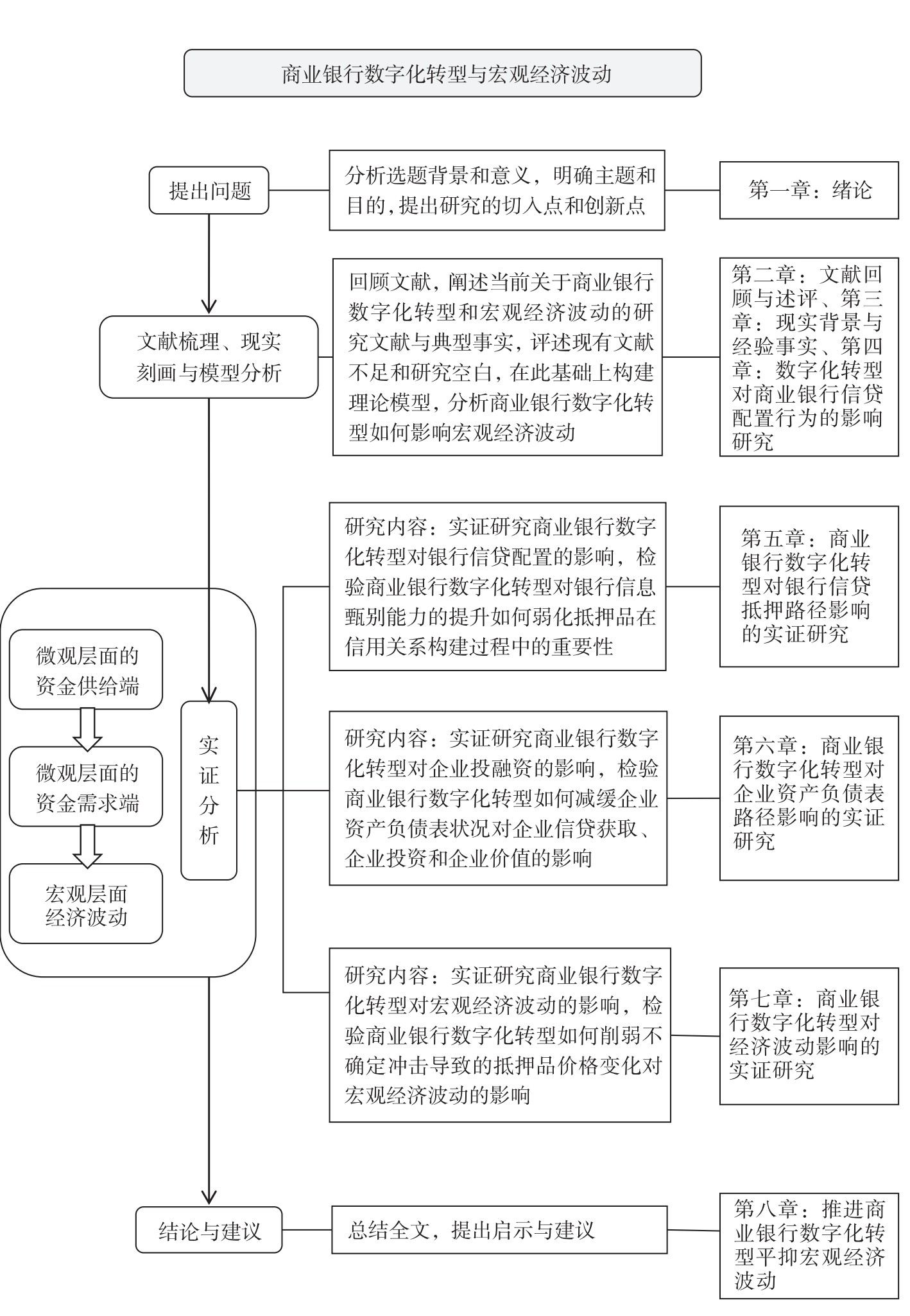 本书基于金融加速器理论,考察商业银行数字化对宏观经济波动的影响。纵观本项研究的内容,是沿着“微观层面的资金供给端→微观层面的资金需求端→宏观层面经济波动”的视角演进展开的。具体而言,首先,基于“不确定冲击—银行信贷配置—企业信贷获取—企业投资与产出—宏观经济波动”的传导路径进行考察,并就商业银行数字化转型提升银行信息甄别能力,降低金融摩擦的机理进行分析,在此基础上从银行这一微观层面的资金供给端和企业这一微观层面的资金需求端的角度检验商业银行数字化转型弱化不确定冲击传导至宏观经济的信贷抵押路径与资产负债表路径。然后,基于宏观层面的中国城市数据检验商业银行数字化转型弱化不确定冲击导致的抵押品价格波动对宏观经济的影响。最后,为优化商业银行数字化转型平抑经济波动提供政策建议。整体而言,本书的逻辑是遵循由微观至宏观的路线执行的,尽可能地实现章节之间的逻辑递进和互嵌。技术路线图详见图1-2。