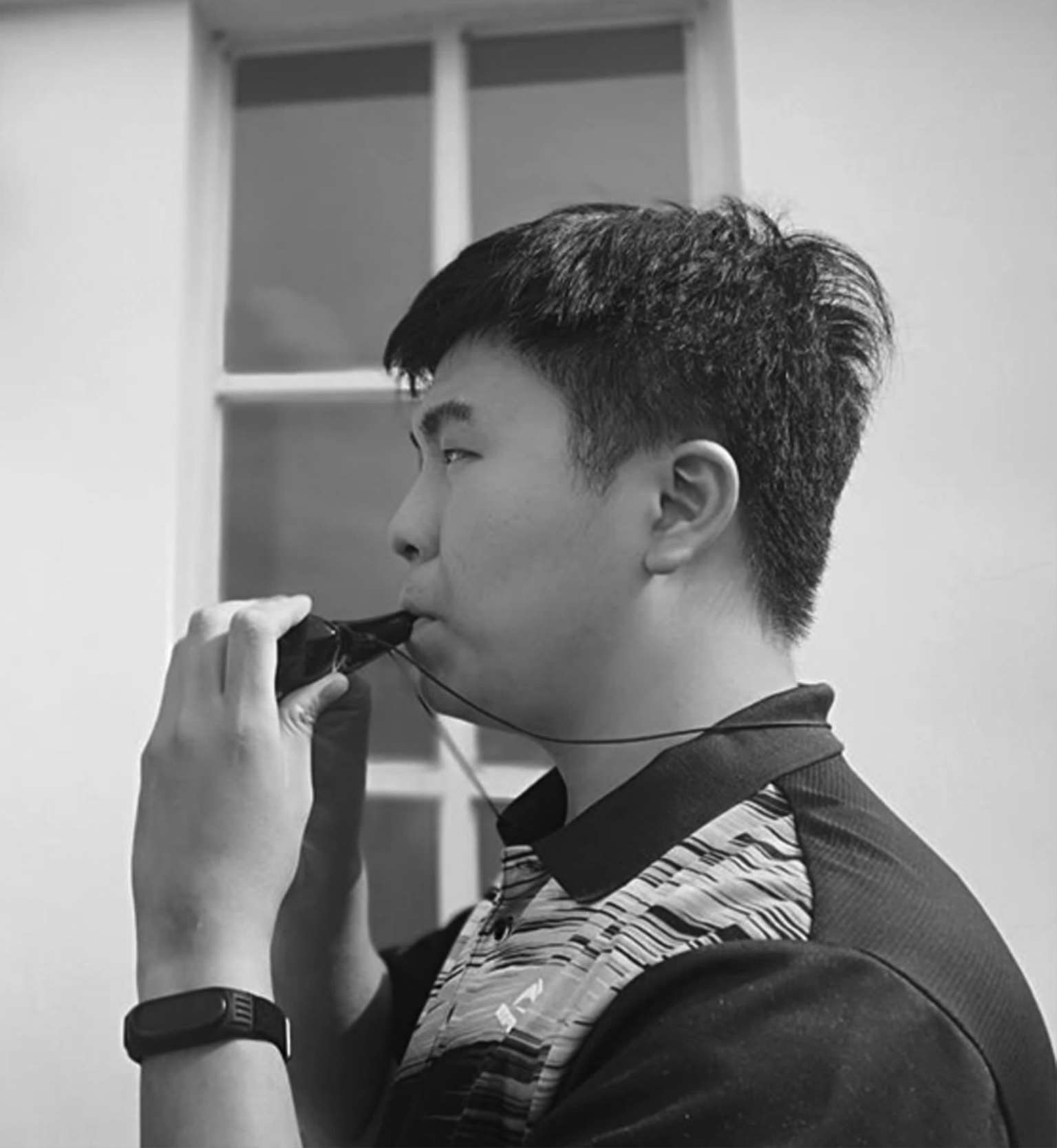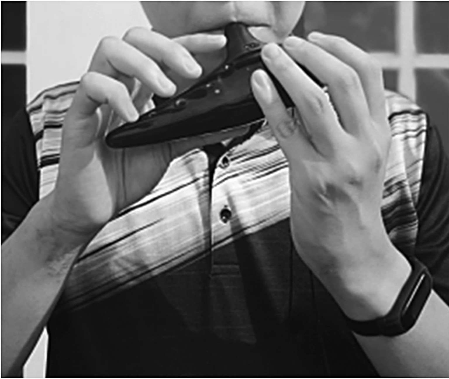 俯吹是用大陶笛吹奏高音时用的特殊技巧。在平吹的基础上,略将头低下,类似俯视地面,双手也随之往里收。这样,下巴和领口可挡住一部分从出音口吹出来的气流,以改善高音音质,使之更饱和、圆润,也能避免发出沙音。如图 3-7所示。