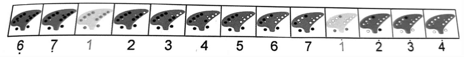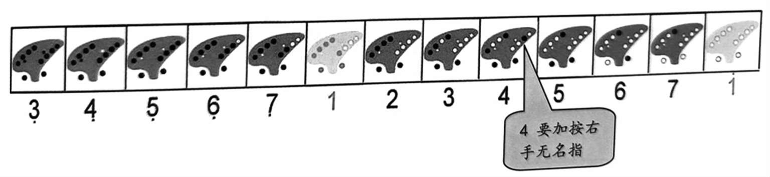 我们以最常见的 12孔陶笛为例,筒音作So(5)的指法中,除了Fa(4)要加按右手无名指来调节外,其余的各个自然音级都是用顺指法。