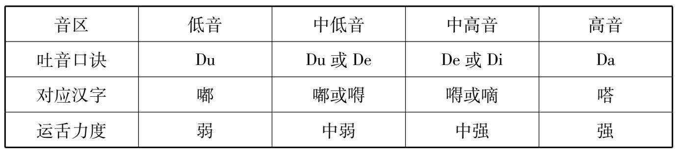 (1)单吐:通常在音的上方标上“T”标记,舌头吐一下吹出一个音,舌头要有寸劲,单吐音才能干净、均匀、颗粒饱满。各音区吐音发声方法如表 3-1所示。