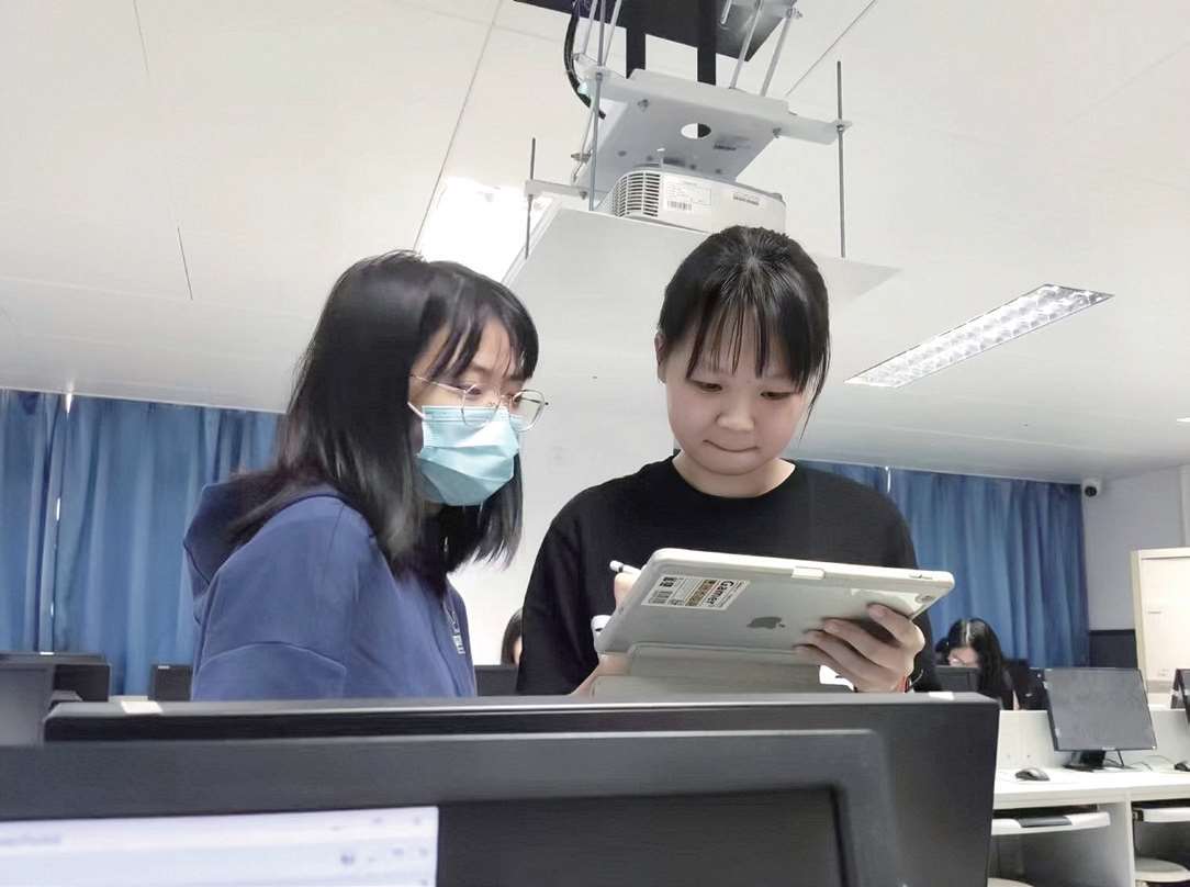 林舒彤(右)与同学在影像诊断学PBL(问题驱动型学习)中讨论病例