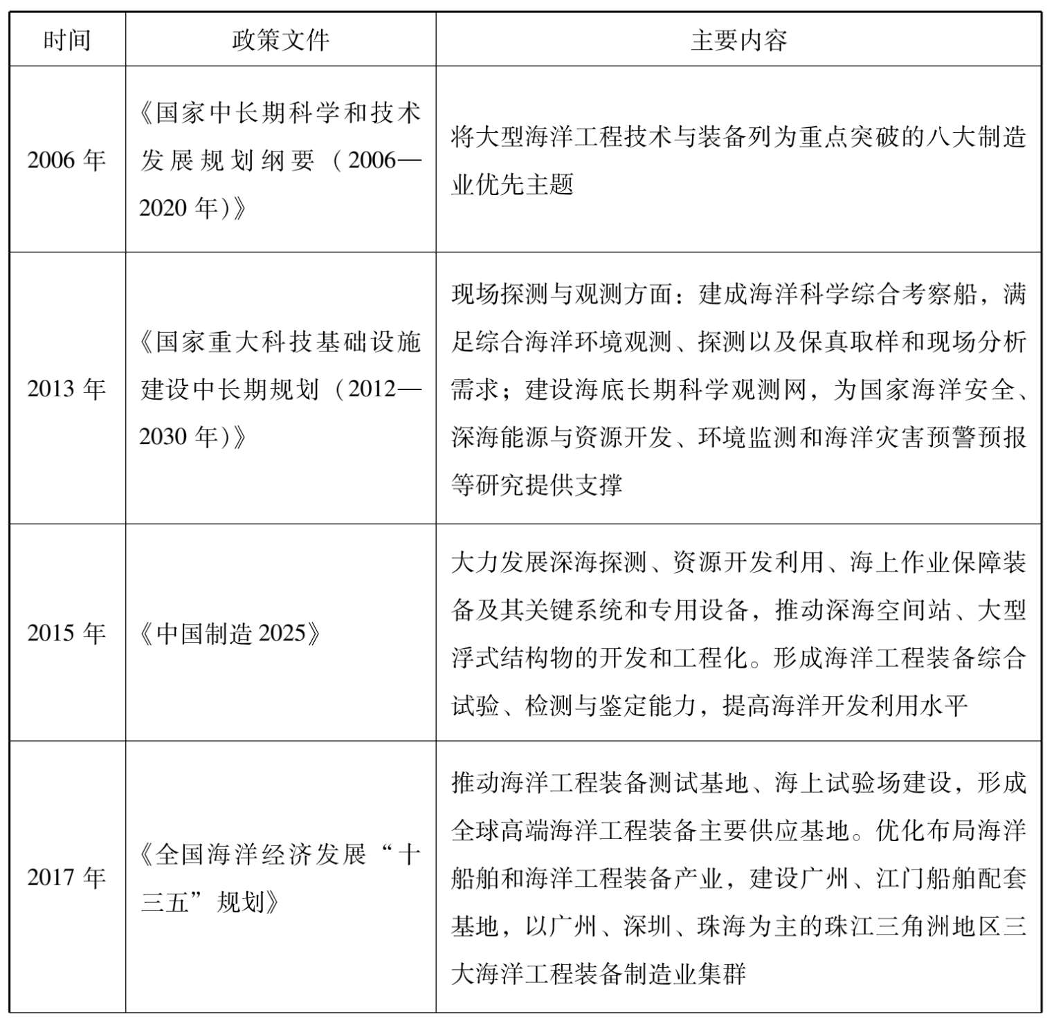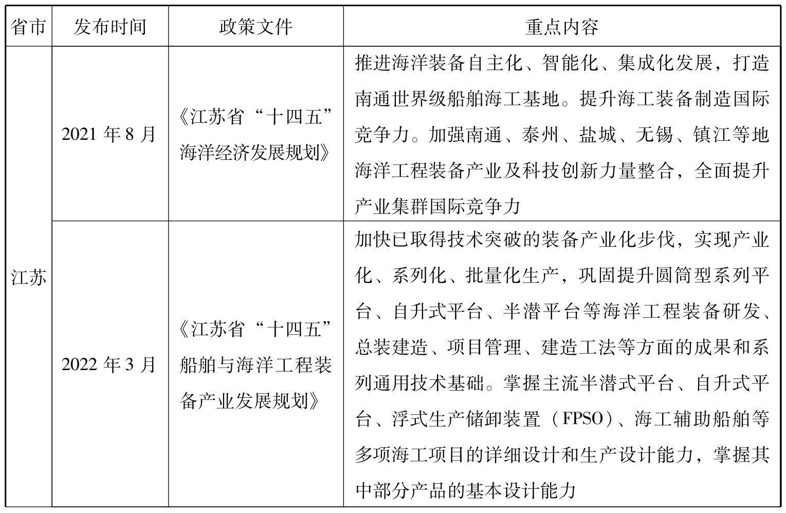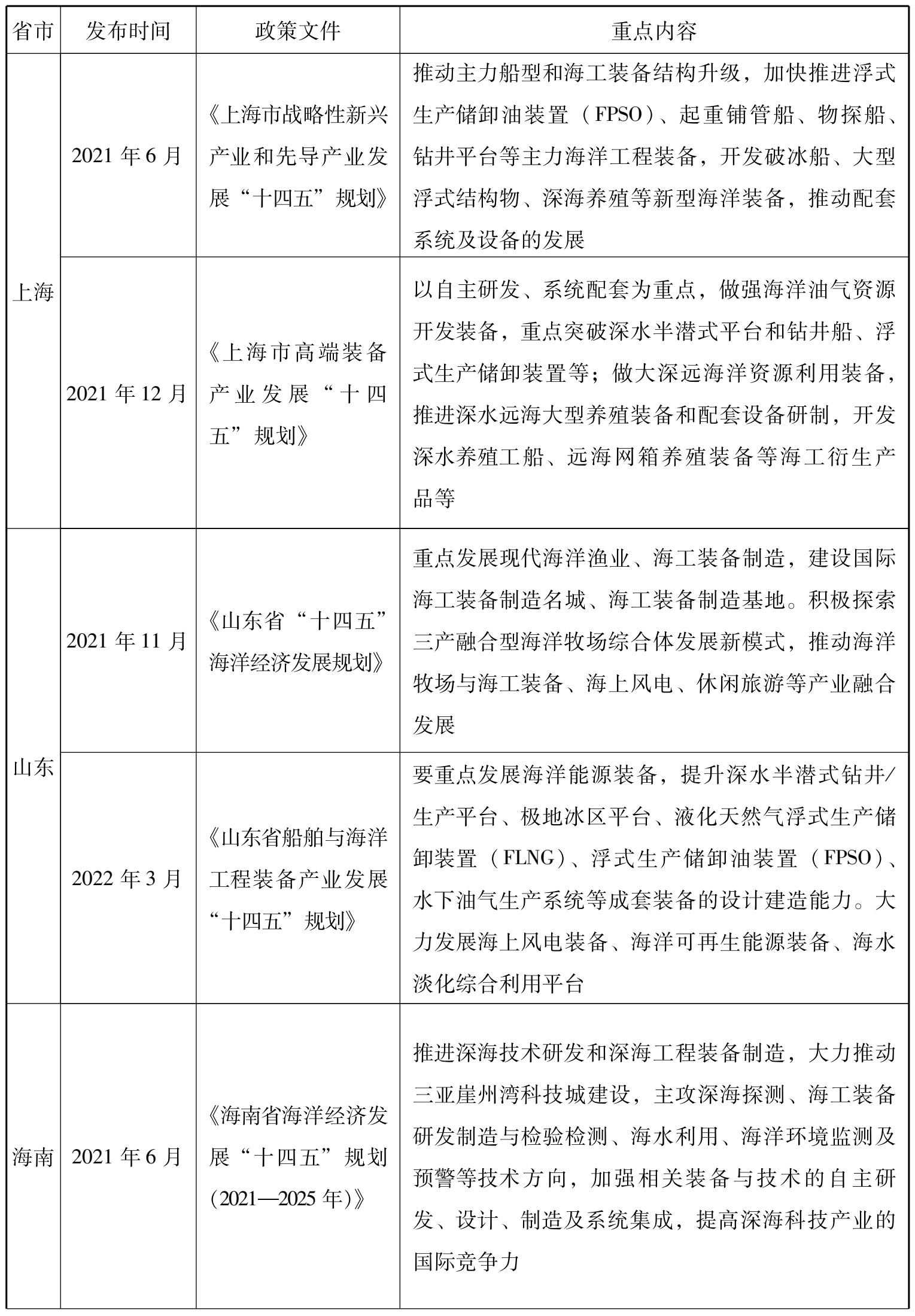 在《中国制造2025》中,国家将海洋工程装备及高技术船舶列为重点推动领域,旨在提升深海探测、资源开发利用和海上作业保障装备的开发能力。国家和省市级层面的政策分别见表2-1、表2-2。