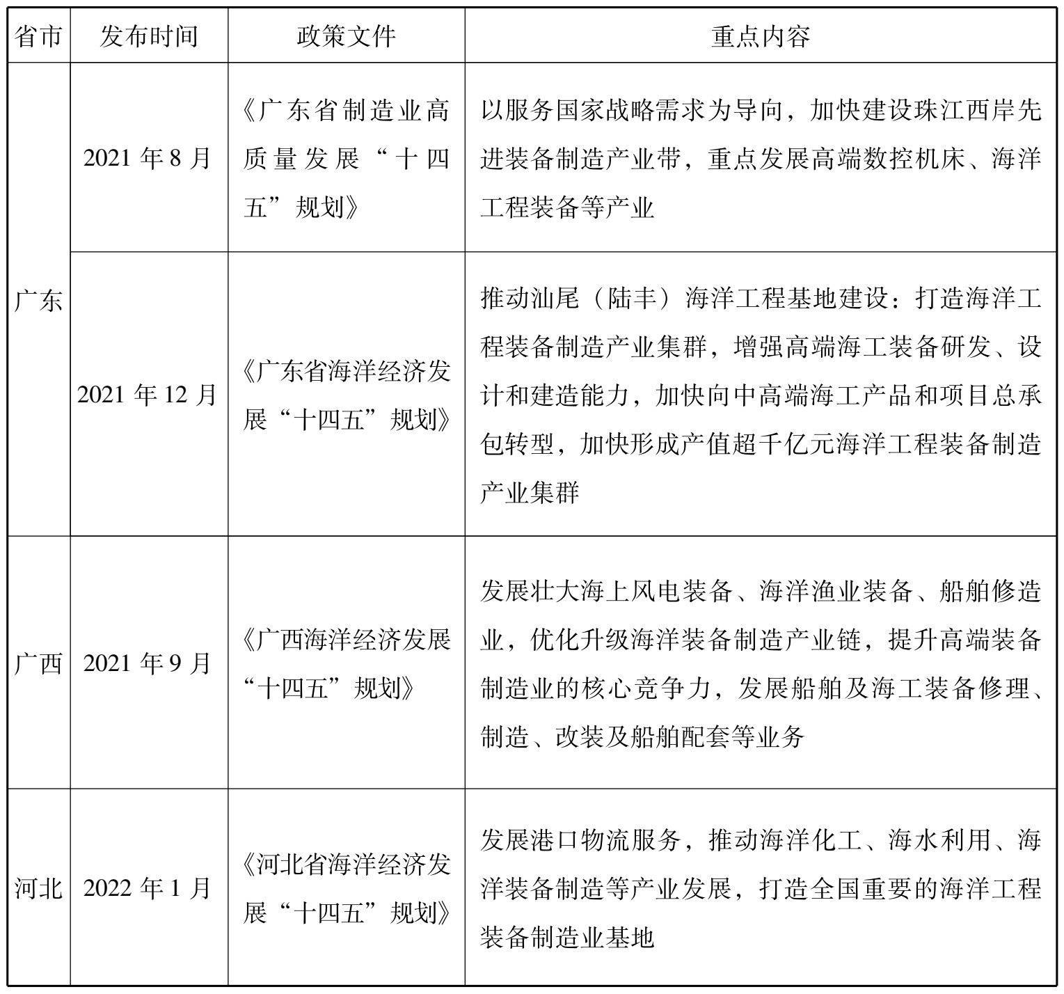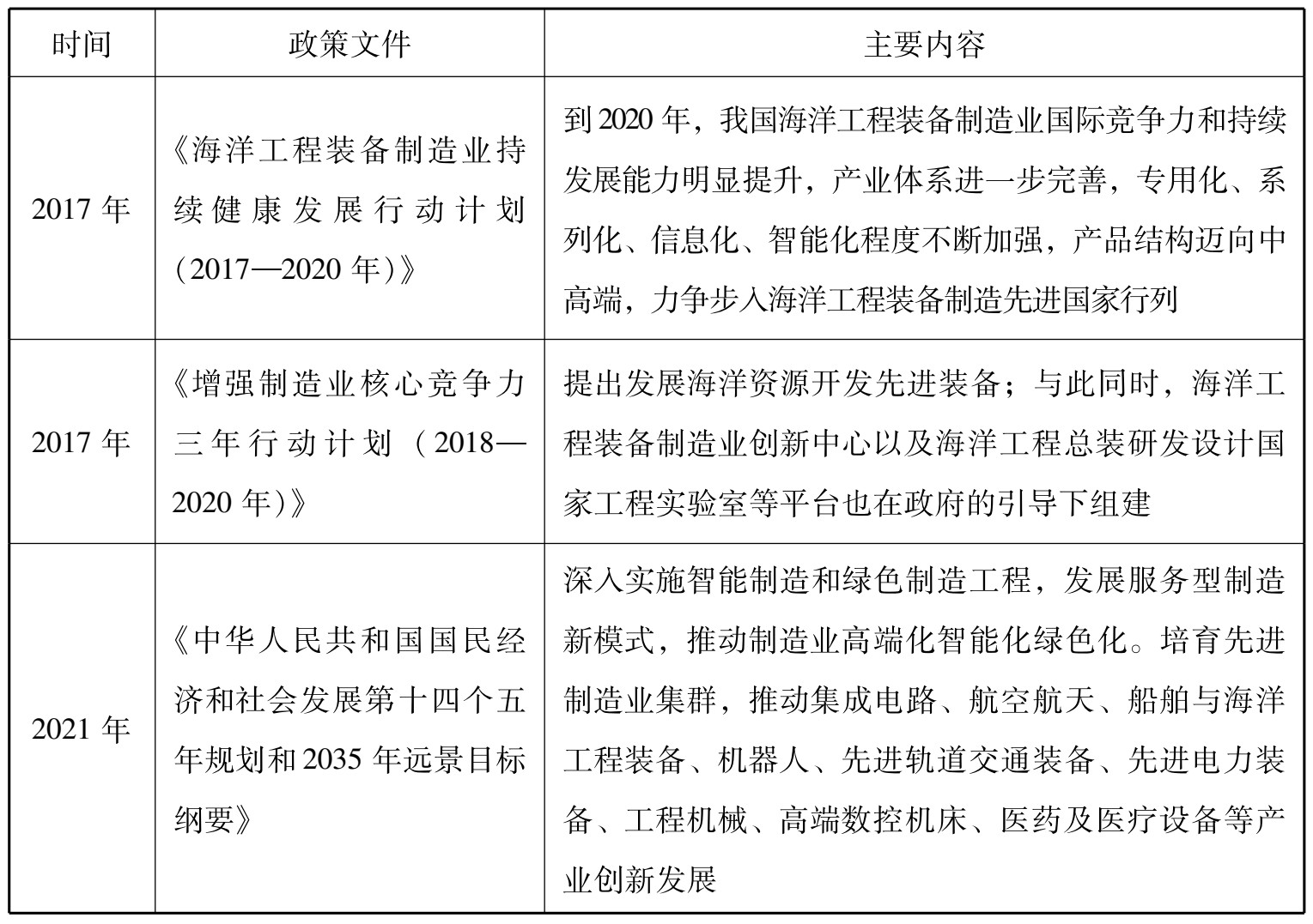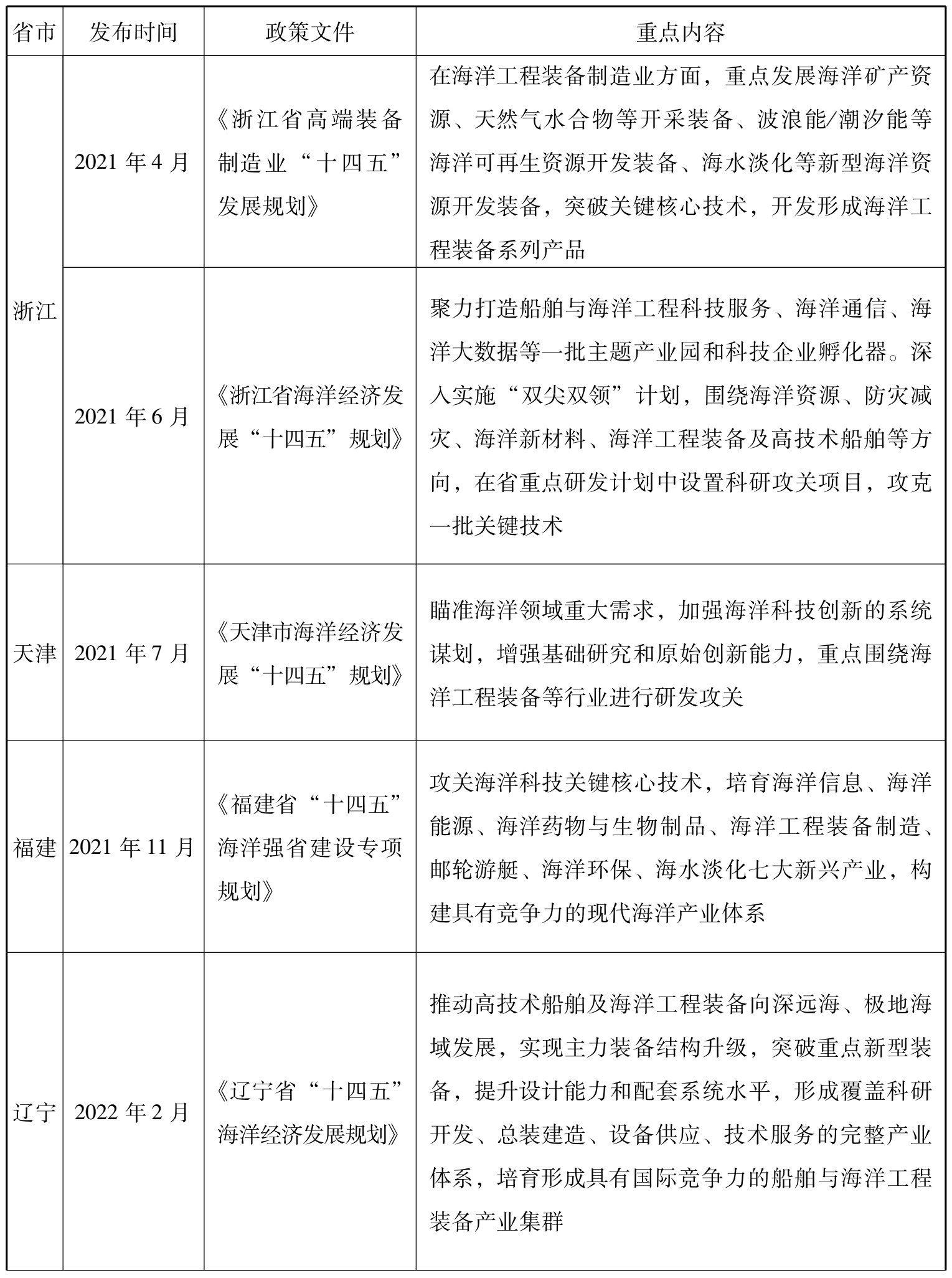 在《中国制造2025》中,国家将海洋工程装备及高技术船舶列为重点推动领域,旨在提升深海探测、资源开发利用和海上作业保障装备的开发能力。国家和省市级层面的政策分别见表2-1、表2-2。