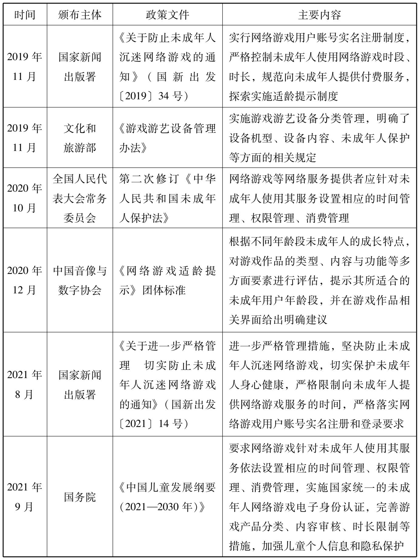 2018—2022年,国家新闻出版署、国家广播电视总局等部门陆续出台一系列政策,逐步构建了以游戏市场准入与未成年用户保护为重点的多维度政策监管体系,从游戏内容、服务时长、实名登录、规范付费等多方面着手,监管上线游戏的数量质量,限制未成年人的游戏时长和付费情况,见表 1-1。