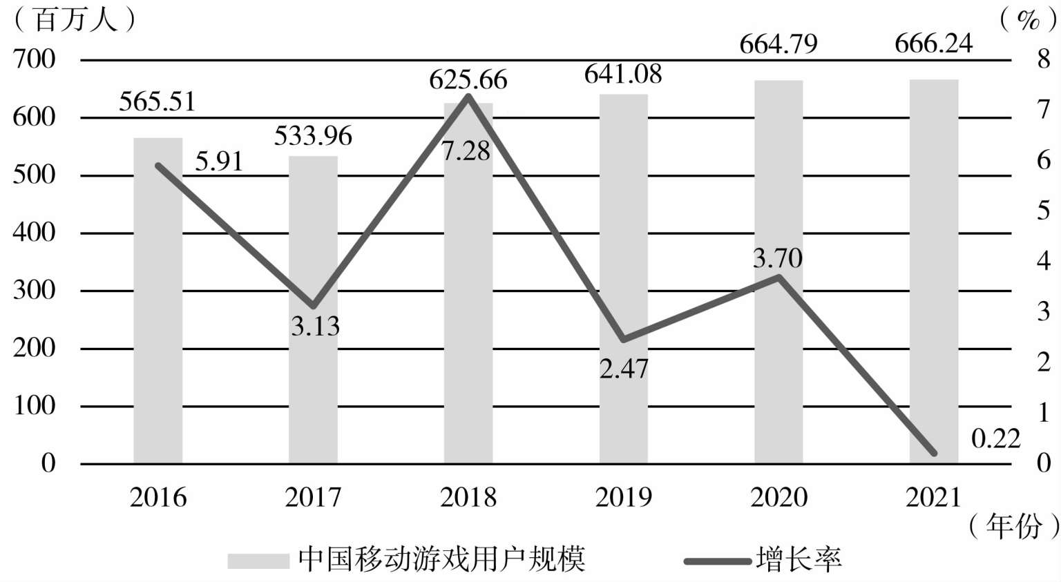 图 1-2 2016—2021年中国移动游戏用户规模及增长率(伽马数据)