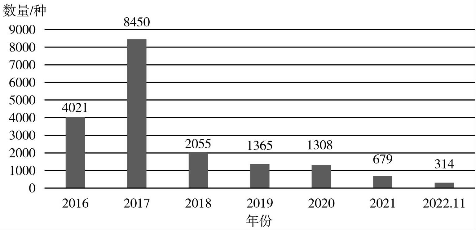 在经历漫长的疯狂生长后,中国游戏产业产能过剩与价值失衡间的矛盾日渐突出。2016年 5月,国家新闻出版广播电视总局下达了《关于移动游戏出版服务管理的通知》,要求游戏上线必须具备国家新闻出版广播电视总局下发的批文号(后称“游戏版号”),未经审核批准的游戏产品一律不得上线运营。自 2016年 7月起,各大游戏厂商急于给不符合上线规范的游戏“上户口”,版号发放数量一度飙升至月均 600~700款。为尽快完善游戏版号审批制度,结束游戏产业乱象,自 2018年 3月起,版号审批全面冻结,将狂飙突进的中国游戏行业带入了首个“冷静期”。同年 8月,教育部等八部门印发《综合防控儿童青少年近视实施方案》,再次明确要求国家新闻出版署实施网络游戏总量调控,控制新增网络游戏上网运营数量。国家新闻出版署公布数据显示,2016—2022年,国内新增上线游戏数量大幅减少,版号审批日趋规范,获批数量从 2016年的 4021个降低至314个(截至 2022年 11月),如图 1-1所示。