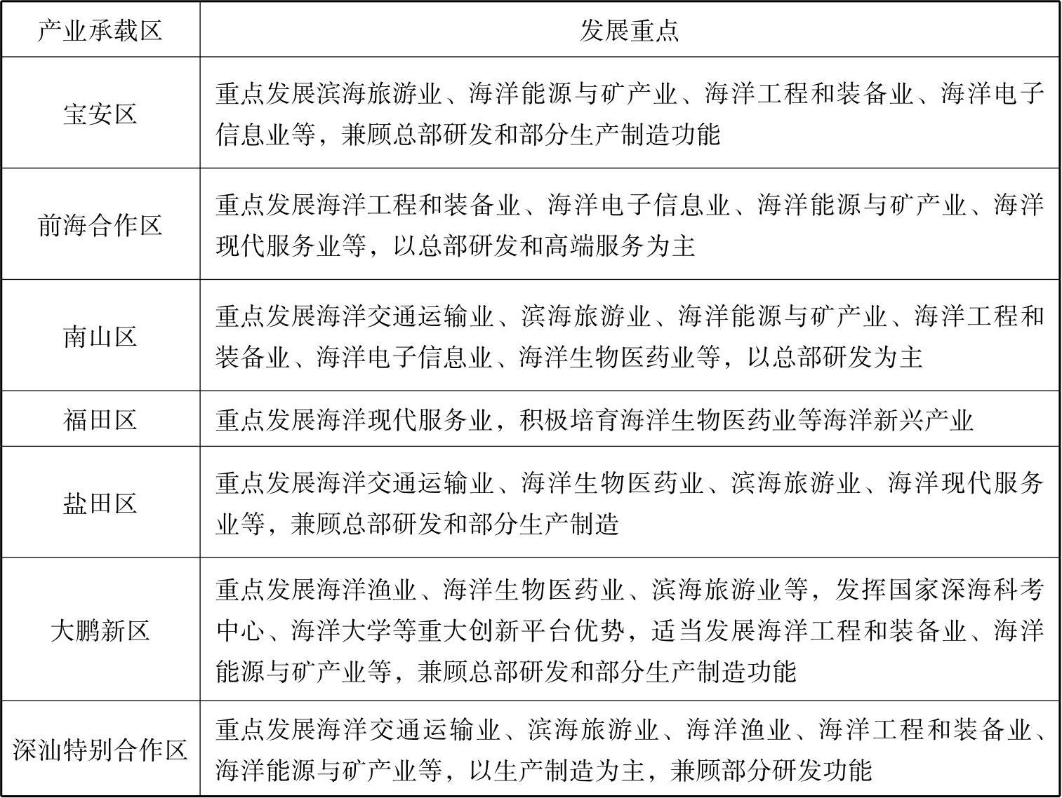 《深圳市海洋经济发展“十四五”规划》提出,到2025 年,深圳全市海洋生产总值达4 000亿元,占全市GDP约10%。从产业布局来看,《深圳市培育发展海洋产业集群行动计划(2022—2025年)》指出,深圳将以西部海岸—东部海岸—深汕特别合作区为主轴,以宝安区、前海合作区、南山区、福田区、盐田区、大鹏新区、深汕特别合作区等为主要承载区,合理布局涉海重点产业、重点项目、重点平台,打造“一轴贯通、多区联动”的海洋产业空间发展格局(见表5-2)。