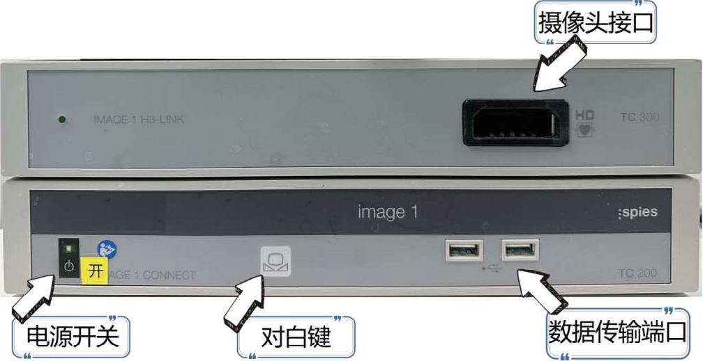 (3)待检测完成后,将镜头对着纯白色表面(如白色敷料),扶镜医生或巡回护士按对白键(见图1-34)。