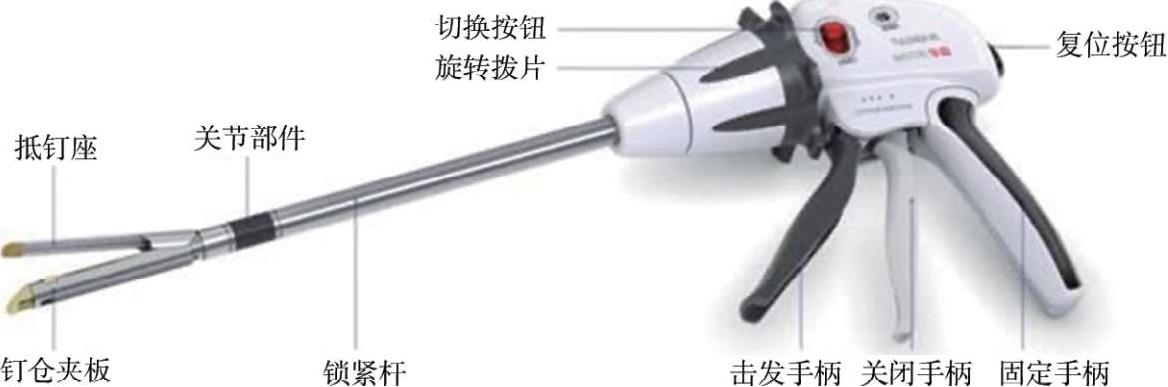 内镜切割闭合器分为两种:枪身带刀片的(见图1-50)及钉仓带刀片的(见图1-51)。