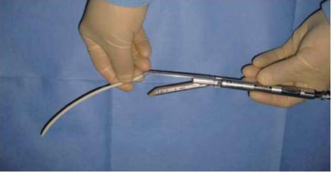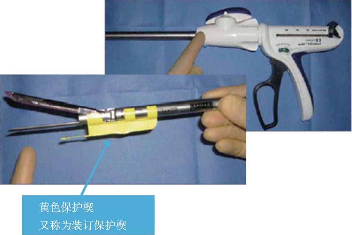 (1)置入体腔(见图1-61)。握紧黑色手柄,关闭钉仓开口,通过穿刺器套管将钉仓置入体腔,然后再前推黑色手柄,使钉仓开口打开。