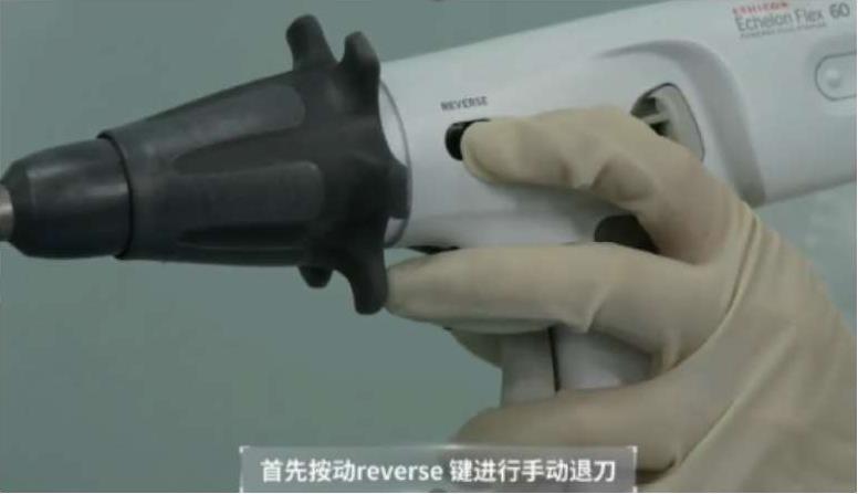 若未安装钉仓,或未正确安装钉仓、安装使用过的钉仓,器械都将会自动锁定。当器械锁定时,首先观察走刀指示器的位置,可按“reverse”键退回刀片。走刀指示器位置正确时,若刀片未退回,检查电池安装是否正确。若按“reverse”键和重新安装电池后刀片均未退回,可将枪身背面的黑色片提起,强行退刀。此时枪身将不可再使用。