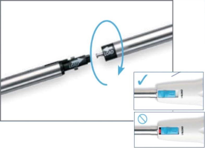 (3)装载钉仓(见图1-58)。使钉仓与枪身上标有“LOAD”的白色箭头相对,平行对合,对合好后顺时针旋转,使钉仓装到位。