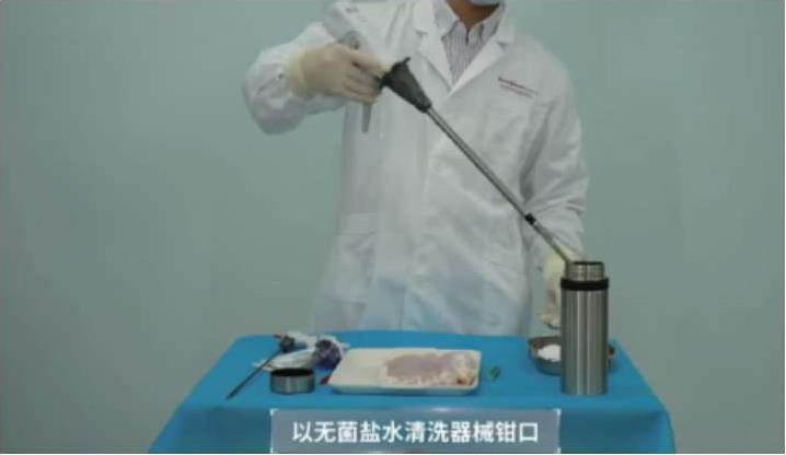 (6)移除器械。松开钳口(见图1-82),拨动调节拨片,使钳口伸直,复位关节头,关闭把手,闭拢钳口,将器械从穿刺孔内移除。