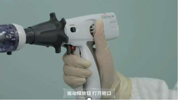 (5)释放钳口(见图1-68)。确认击发完全后,将黑色兔耳钮向后拉至顶端,释放组织。再次握紧黑色手柄,将钉仓开口关闭,从穿刺器套管中取出。