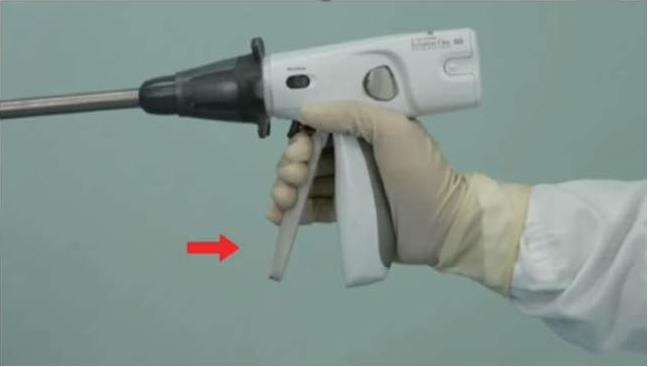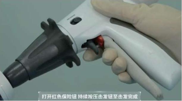 (4)器械击发(见图1-64)。逐次匀速握紧黑色手柄,采用15秒匀速击发法,全拉全放,每全拉一次前进15mm直到握不动为止。同一把枪可在单个患者身上击发25次。