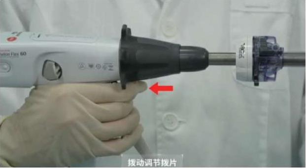 ②夹闭组织后,若需调整闭合位置,只需前推黑色手柄,即可使钉仓开口打开,以便再次定位。