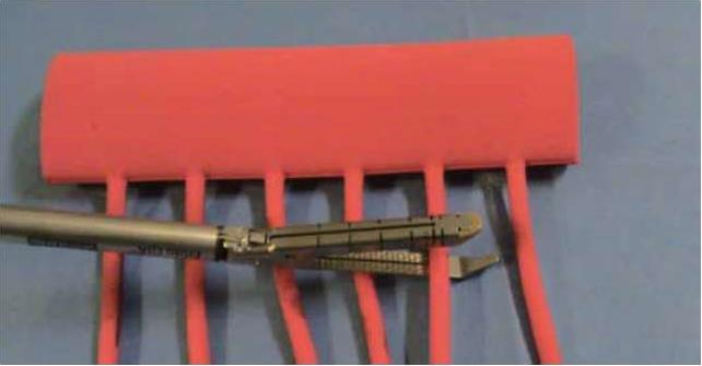 ⑤不要使夹闭组织的远端太靠近钉仓的组织中止标志线,因为组织延展超出黑色切割线的部分都不会被切割。