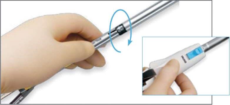 如果钉仓呈旋转状态,卸钉时以及器械从穿刺器取出前,务必提前将钉仓调节回非旋转状态。