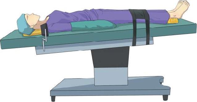 (1)嘱患者仰卧于手术床上,平卧至合适位置(如果进行妇科腔镜下子宫、卵巢手术,臀部需超出床沿5~10cm);头部置于头枕并处于中立位置,头枕高度适宜。头和颈部处于水平中立位置。