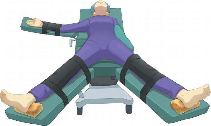 ②麻醉前让患者移至合适的位置,手术医生调节腿板,使双下肢分开,分别用约束带固定。