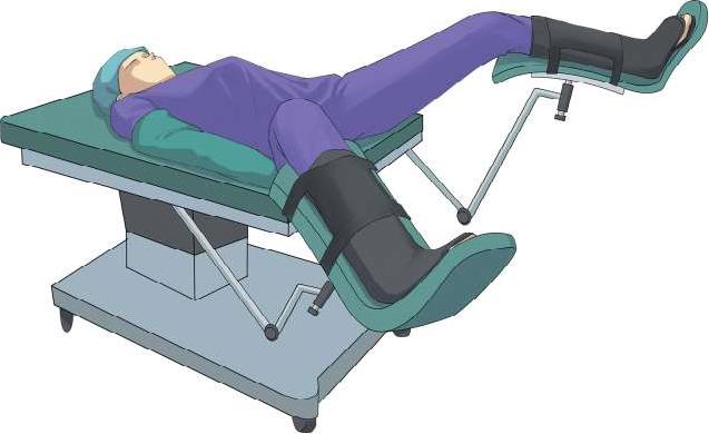 患者平卧在床上,双腿放置于腿架上,使患者大腿与腹部保持在同一水平面上,屈膝,大小腿间约呈120°,足部尽量外展以防止腓骨小头与腿托接触紧密,腘窝处悬空,两腿间分开角度约为85°。臀部移至床边(见图2-6)。