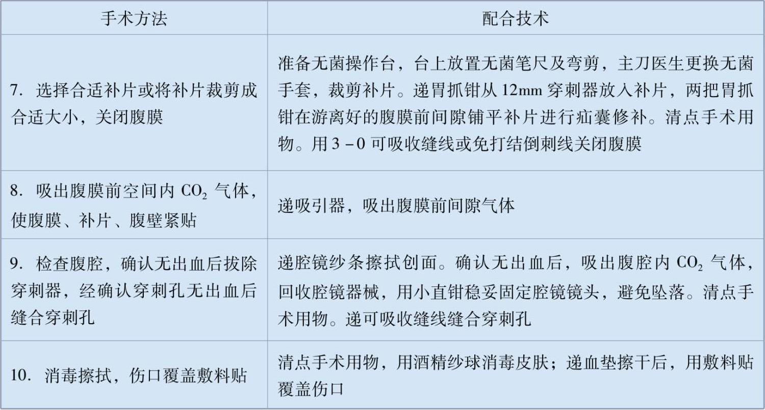 表3-2 腹腔镜腹股沟疝修补手术方法与配合技术