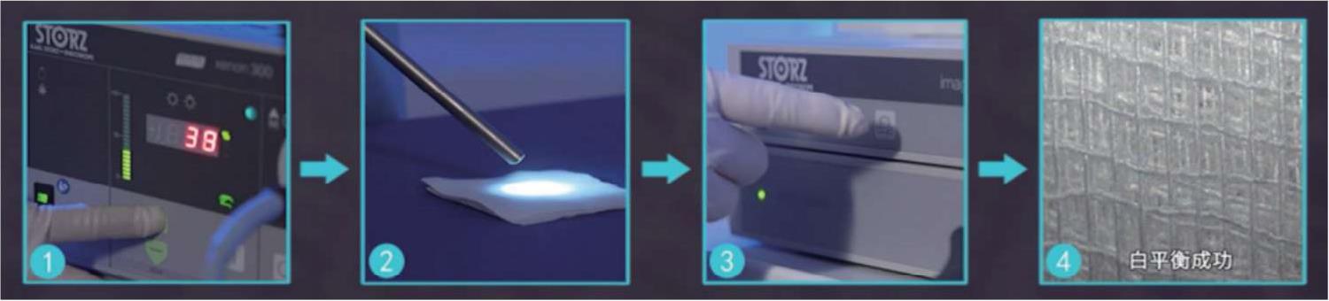 ②使用内镜观察纯白纱布,使白色覆盖整个视野,并保持图像清晰。