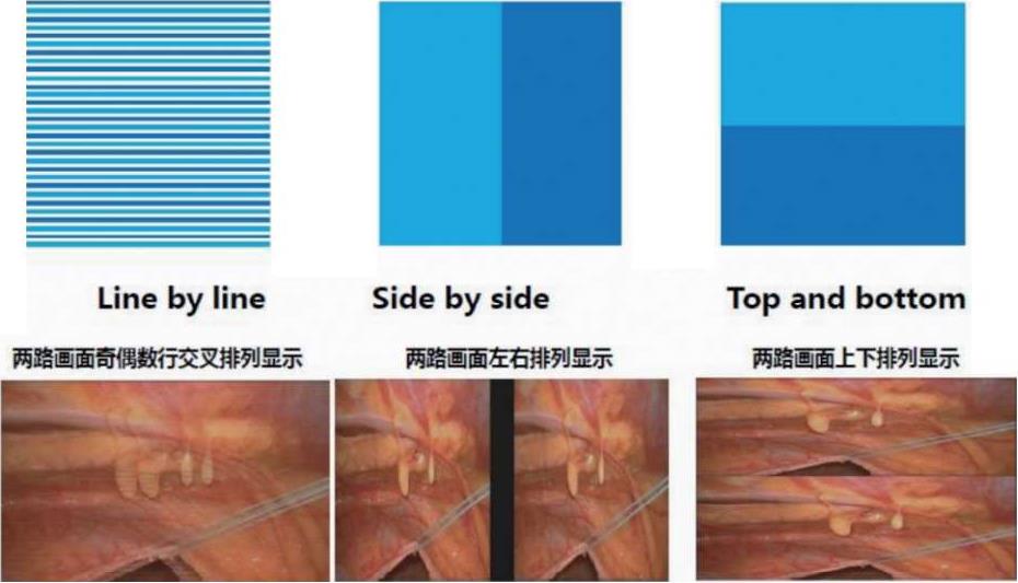 常见的3D视频格式有“逐行(Line by Line)”“左右(Side by Side)”和“上下(Top and Buttom)”三种格式(见图1-24),通过3D监视器呈现3D影像时,要确保3D输出源信号与监视器设定的相同。KARLSTORZ影像主机输出的3D视频信号为“逐行”格式。“左右”和“上下”格式通常为3D影像的存储格式。使用PC端3D播放器(如Potplayer)在3D监视器上播放3D影像时,要注意3D视频源的格式、左右眼画面的设置和3D监视器的设置相匹配。