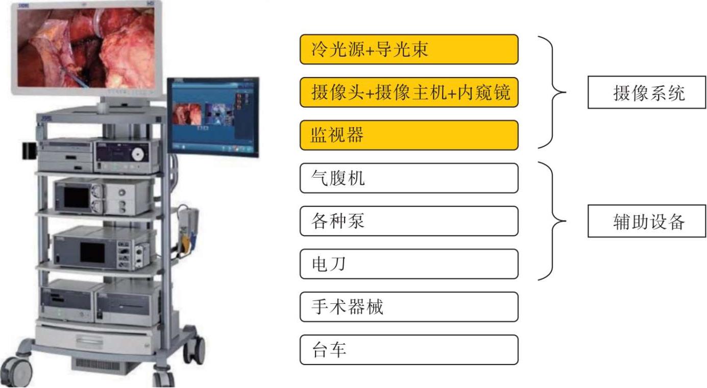 摄像系统是在微创手术中,实现光学影像采集、传输、处理及最终显示的一整套设备的合称(见图1-3)。在腔镜系统中,一般包含冷光源、摄像头、摄像主机和监视器四个设备:冷光源提供照明,摄像头完成光学影像采集及光电信号的转换,摄像主机则负责信号处理与还原,并最终在监视器上进行影像重现。可以说摄像系统是整个内窥镜系统最核心的部分。