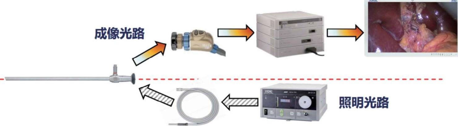 摄像系统给术者提供镜下画面,是术者眼睛的延伸。术者可以通过人体自然腔道或人工制造的细小腔道将内窥镜置入患者体内,再通过内窥镜摄像系统采集镜下画面并在医用监视器上呈现,从而观察病灶并进行一系列外科手术操作。
