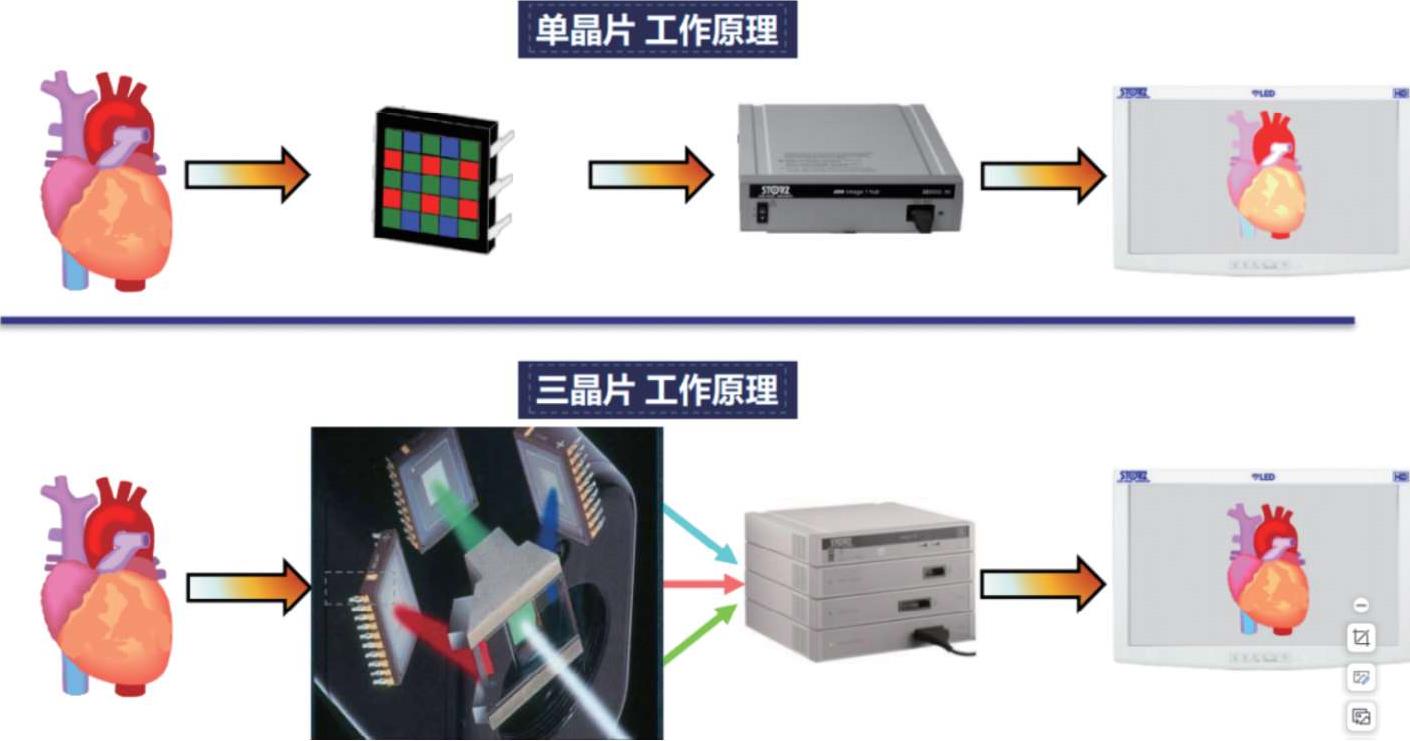 单晶片指通过一枚光电传感器进行图像的光信号采集,并转化为电信号,然后经过图像处理芯片输出到监视器。三晶片首先使用分光棱镜,将可见光线色散为红、绿、蓝三原色,然后使用三枚光电传感器,分别对光的三原色进行采集,并转化为电信号。最后通过图像处理芯片将三原色图像进行结合,再输出给监视器。