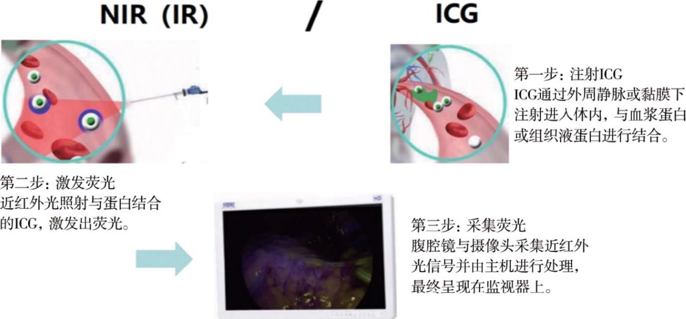 以红外光照射注入人体中的ICG,使之产生荧光,随后用荧光影像设备捕捉荧光信号,转换成肉眼可见的颜色显示在监视器上,这一技术被称为NIR影像技术(后文简称为ICG荧光影像技术或ICG技术)。ICG通过静脉注入体内后,能立刻与血浆蛋白结合,随之迅速抵达全身;若通过组织间或黏膜下注射ICG,ICG分子则会与淋巴液中的蛋白质结合,随着淋巴液,途径淋巴管、淋巴结,最终进入静脉。若组织器官中存在肿瘤,ICG分子则会被肿瘤细胞高摄取,并在其中滞留较长时间。然后,用特制的近红外光光源照射所需观察的组织器官,便可激发荧光。再通过能感知红外光的摄像头捕捉内镜传递来的荧光,由摄像主机处理信号,以特定的色彩标记荧光,最终就能使监视器上呈现出肉眼可见的“荧光”部位。