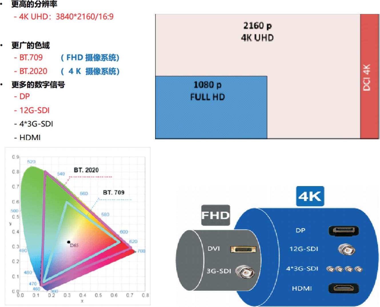 在各厂牌影像系统中,4KUHD超高清视频信号传输常见的接口包括DP (Display Port)、HDMI (High Definition Multimedia Interface,高清多媒体接口)、SDI (Serial Digital Interface,数字分量串行接口,12G- SDI/4x3G- SDI)等。