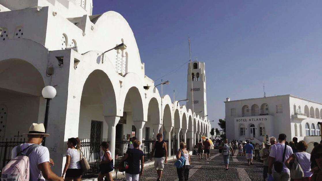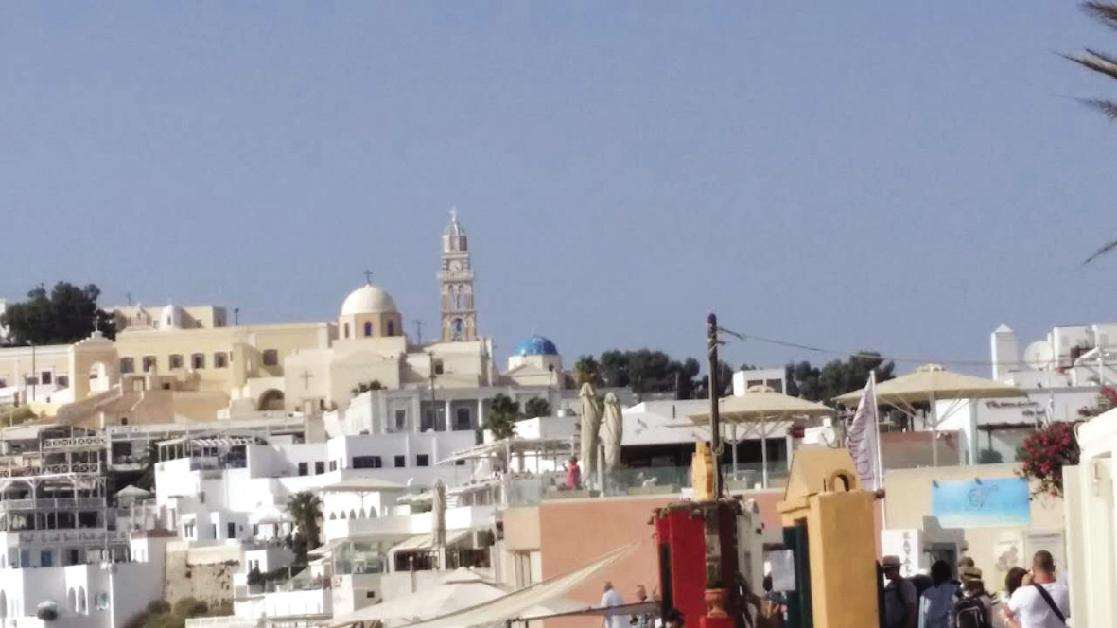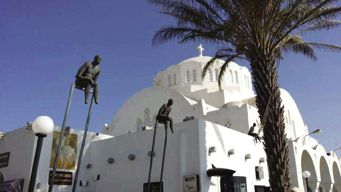 希腊圣岛独特的风景,蓝白相间,最大的白色教堂在蓝天下屹立,两个青铜制作的雕塑尽情地俯视着来往游客,形成一道独特的风景线。