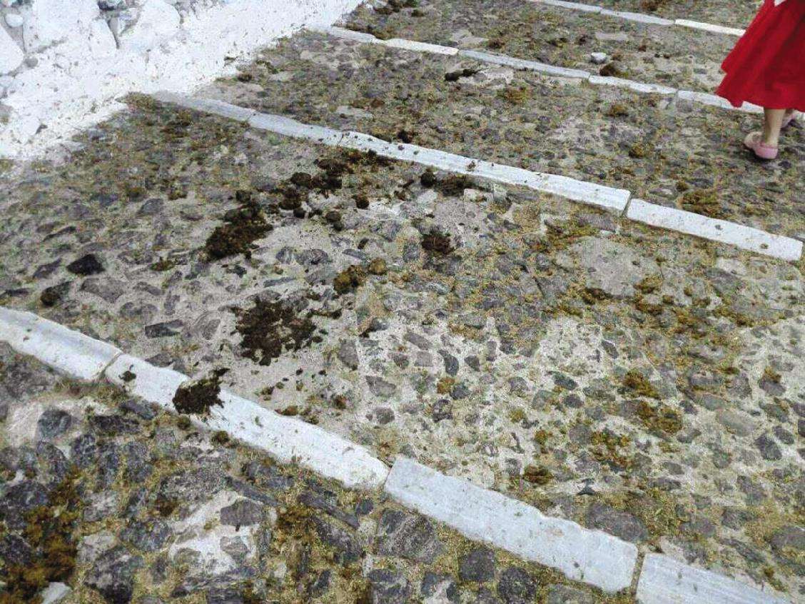 谁会想到,当我们走出旧货市场,来到一个高山之巅,垂直往下看,山巅到海边的码头,也就几千米吧。要命的是,这几千米不是直线,而是弯弯曲曲的、大大的“之”字形道路,这就意味着,本来 1000 米的距离,“之”字形后,就变成 2000 米,或者 3000 米。更要命的是,希腊人为了做生意,在这条从山巅到海边的道路上,安排上了驴子、骡子和马,为不愿意走路的游客服务,每个人只要支付 5 欧元,就可以在驴背、骡子背或者马背上完成艰难的跋涉。